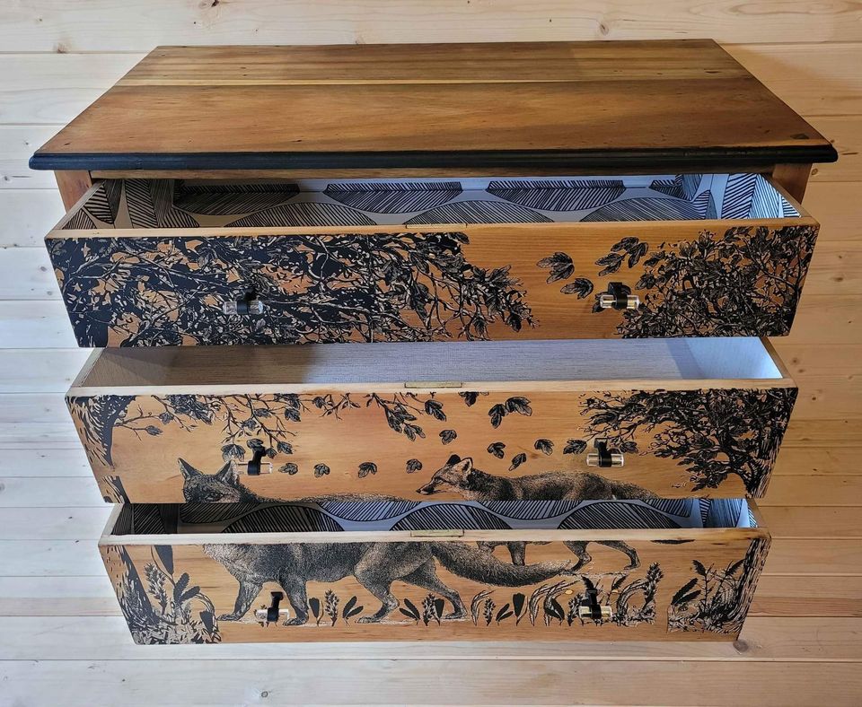 Description: Crafted with meticulous attention to detail, the Fox Meadows Chest of Drawers features three spacious drawers, each adorned with intricate flower-inspired motifs and lined with matching paper. The sleek black hue, accented with subtle gold touches and exposed wood elements, exudes modern sophistication, making it the perfect complement to any contemporary decor.