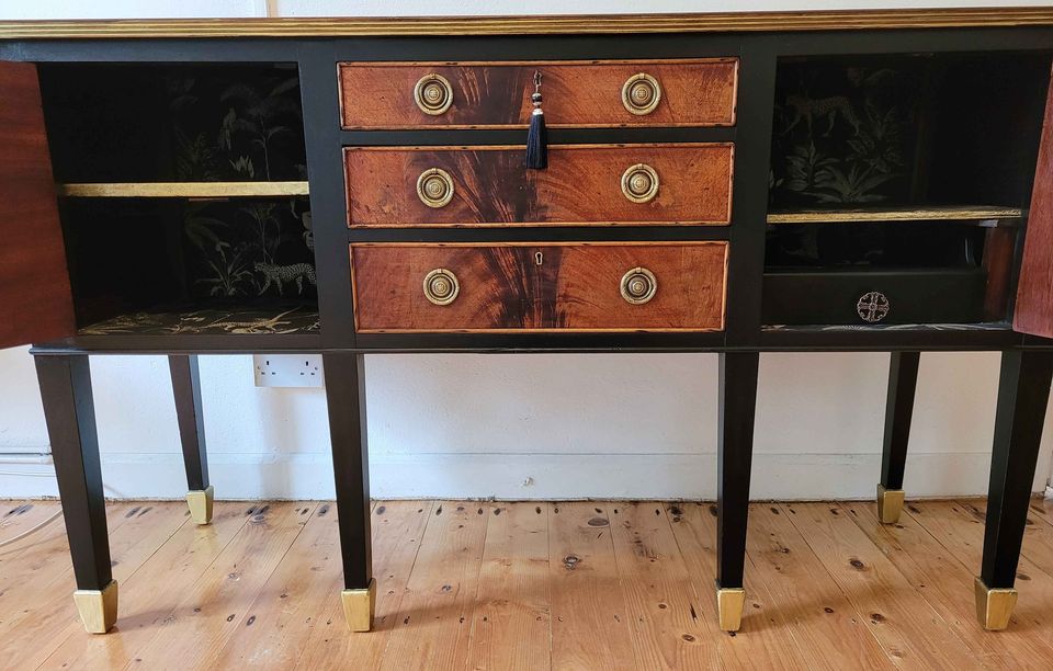 Whether gracing your hallway, enriching your dining room, or adding character to a contemporary room, this sideboard | buffet cabinet is a versatile accent piece. The interior and all drawers are lined with beautiful animal print paper, adding a touch of sophistication to its design.